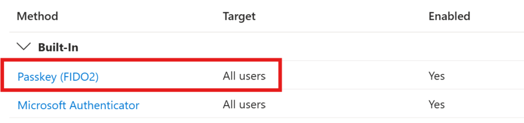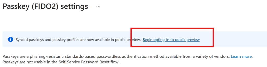 At the top, we need to Opt-In to the public preview settings. Currently it’s not possible to use passkeys in the password reset flow (SSPR) as an authentication method.