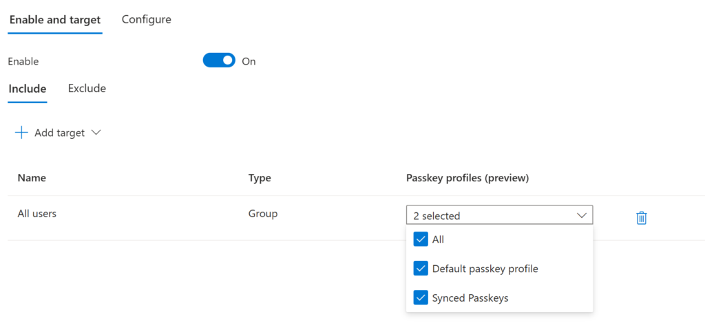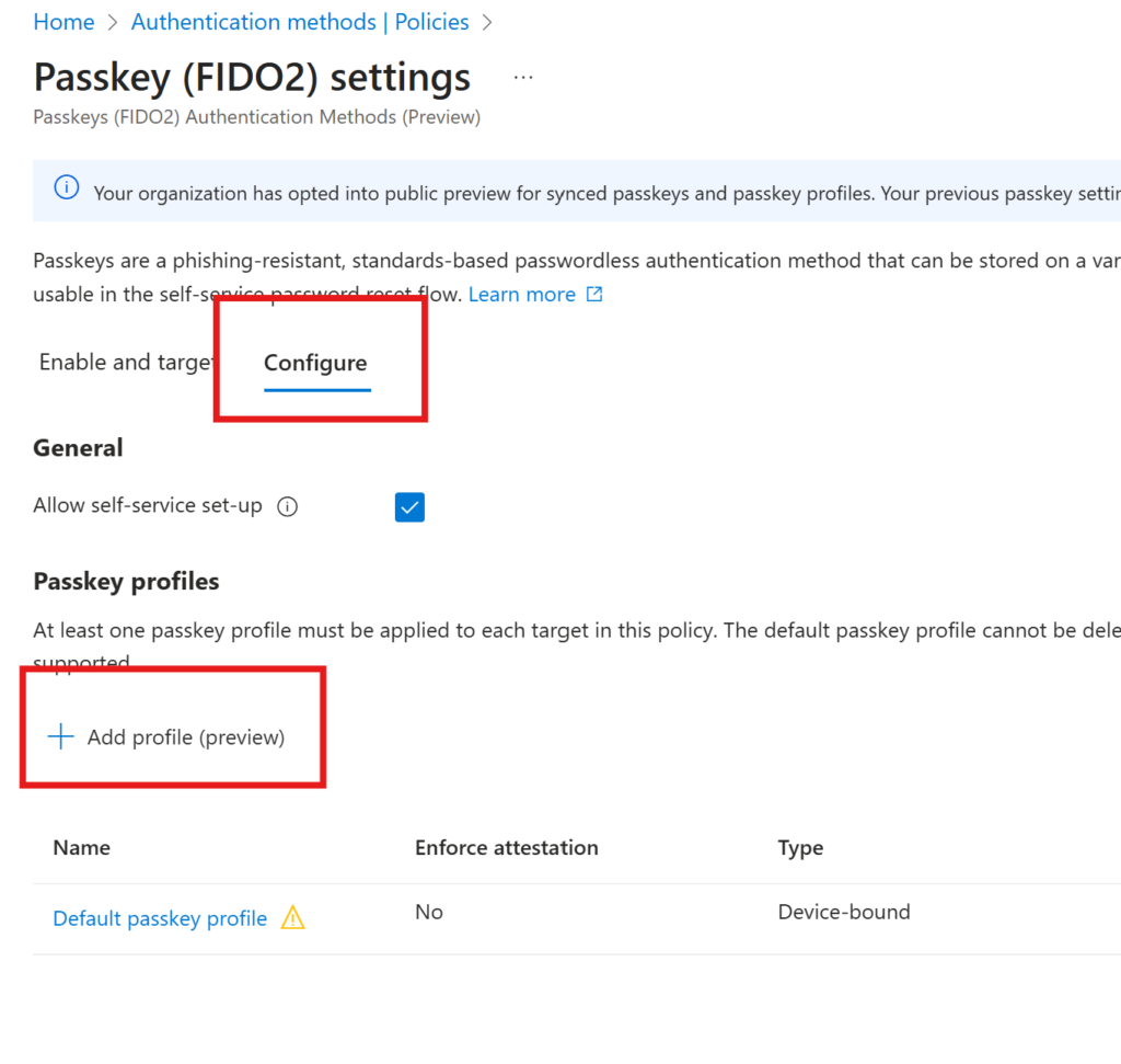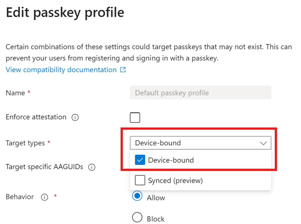 Attention: If you include the synced target type into the default profile, you cannot enforce attestation anymore! So for the default profile, we should just add device-bound and enable attestation. For users (test-users đ) who should be able to use synced passkeys, we should create a separate profile and assign it accordingly!